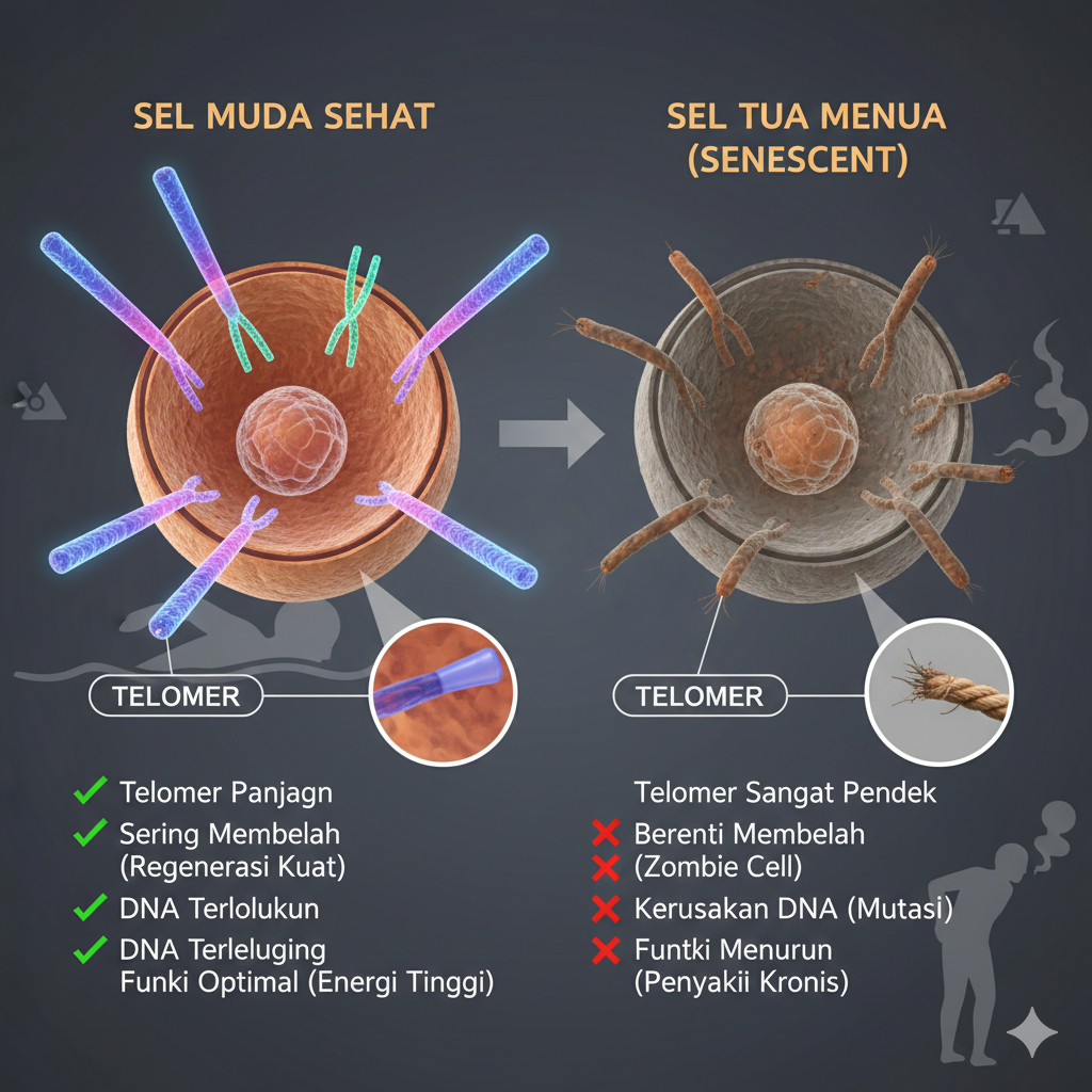 Telomer adalah urutan DNA berulang di ujung kromosom yang berfungsi sebagai pelindung. Setiap kali sel membelah, telomer ini akan sedikit memendek. Ketika telomer menjadi terlalu pendek, sel tidak dapat lagi membelah dan akhirnya mati atau menjadi “senescent” (sel zombie yang merusak jaringan di sekitarnya).